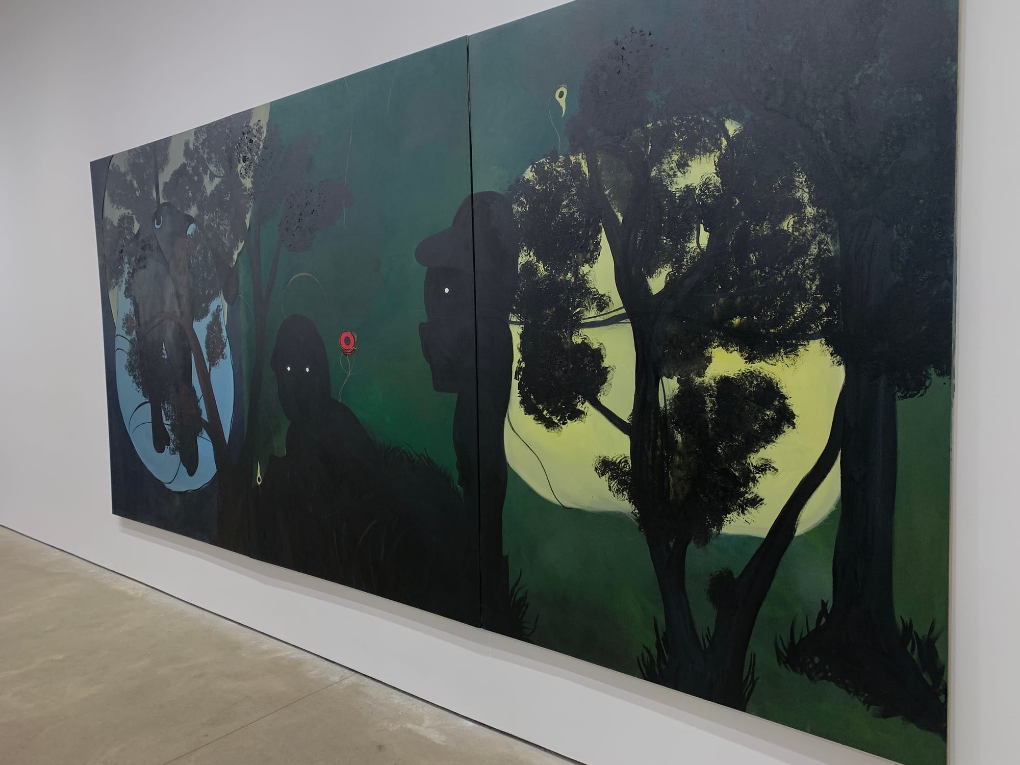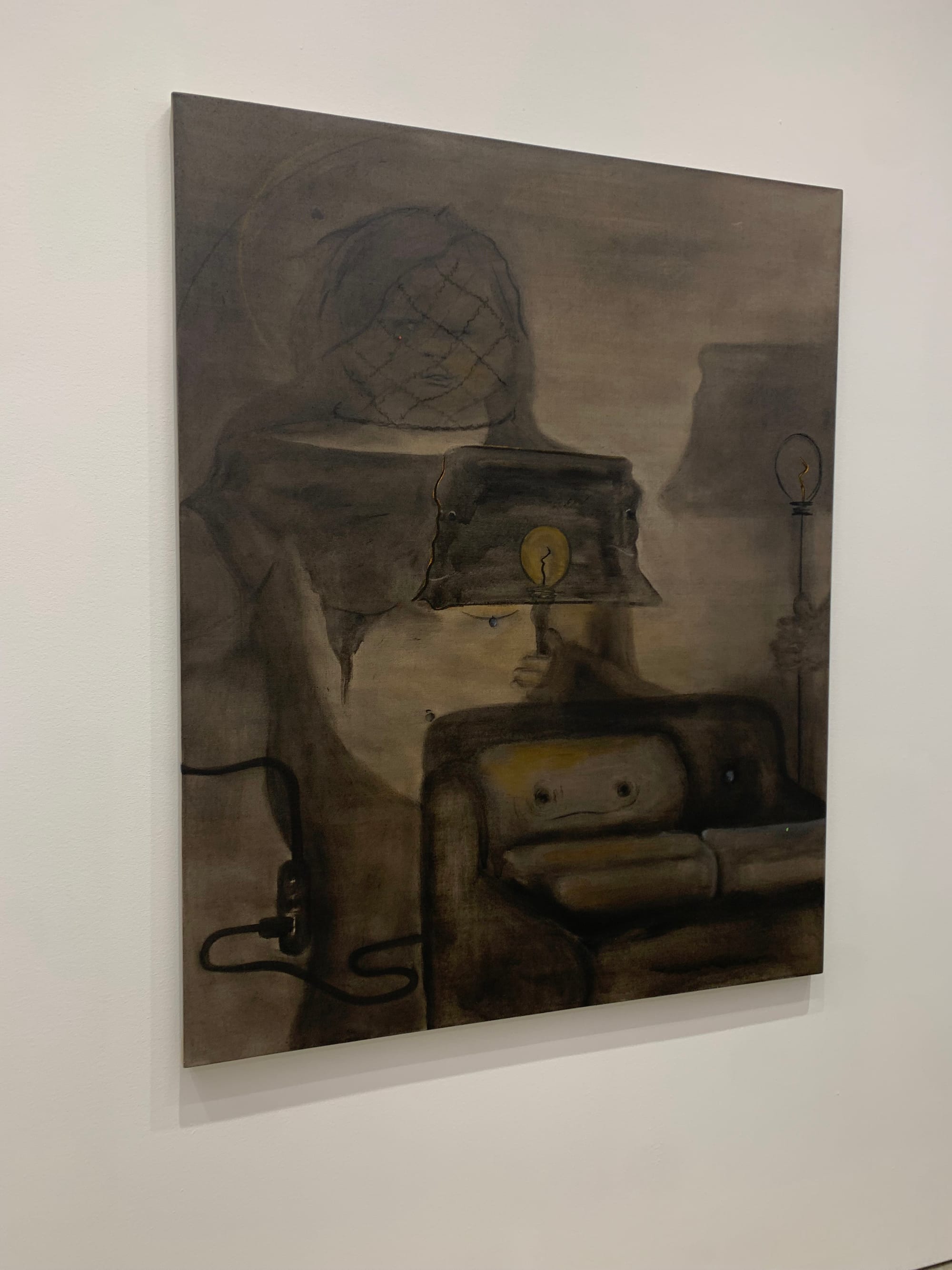 Upon entering the second room, the works settle into a certainty of melancholy, nostalgia, and (visual) darkness. On an aesthetic register, they were gorgeous meditations on these particular themes: each work uses the darkness of the figures and the backgrounds to play on tropes of nightmares and uncanniness. However, comparatively, these works drift away from the thesis of the exhibition save one work that articulates a hauntedness of the domestic by crafting a simple home furnished with a couch and a dim lamp and materializing a veiled face that looms over the entirety of the constructed space. This room is also significantly less provocative and less referential to the queerness which flows dramatically through the first room. Nonetheless, the works are stunningly dejecting even if a bit disconnected from the more impactful works that make up the rest of this exhibition.
