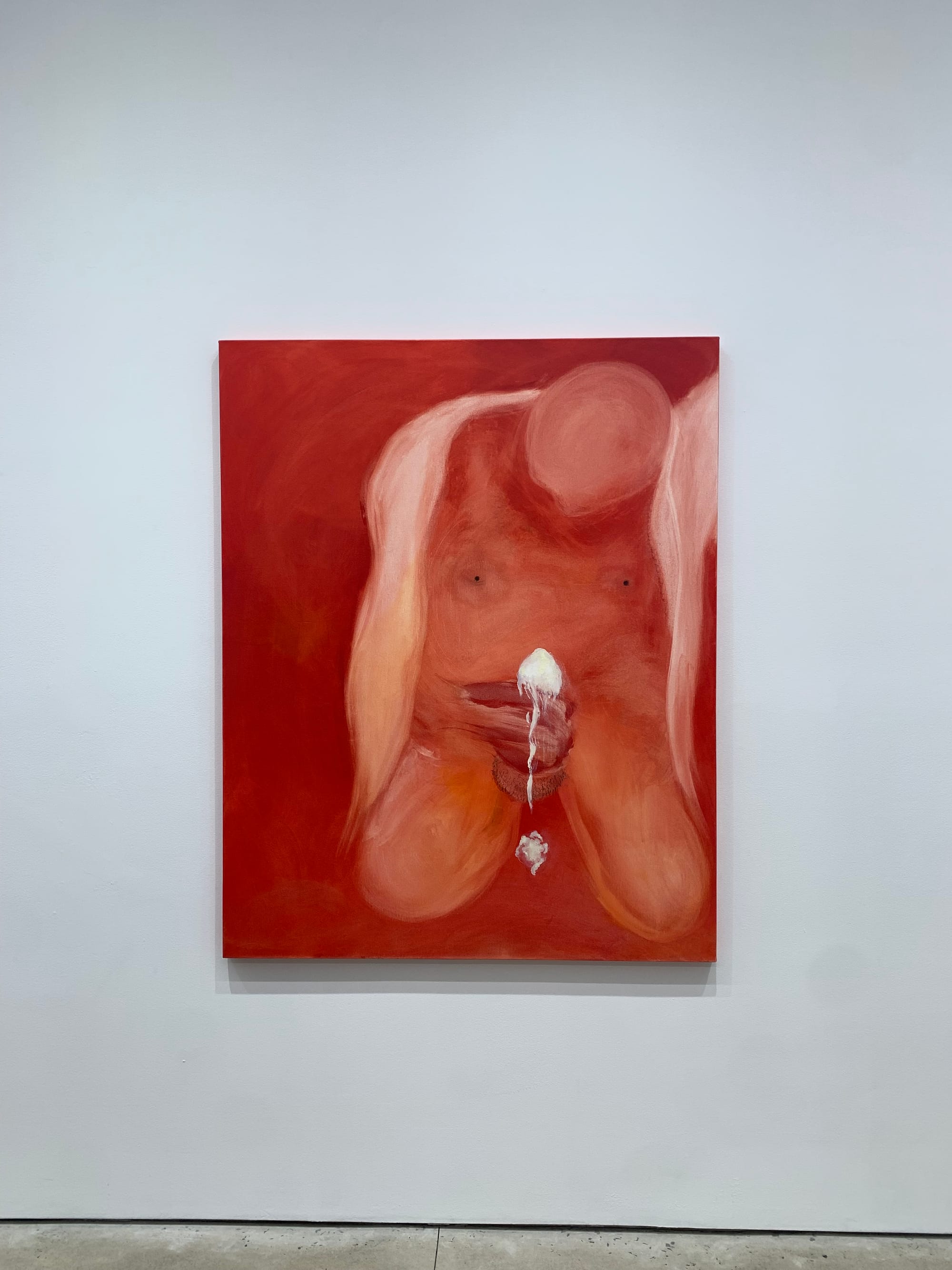 The first room presents a thesis of queerness’s relationship with obscurity and loneliness—an entirely-green painting which displays a figure kneeling, hunched, curling in upon themselves as if to shy away and isolate from their viewer or an entirely-red painting with a figure similarly hunched and retreating from their viewer, hand clasped around an ejaculating penis (alluding to an overwhelm of sensation or emotion that imposes a pursuit of privacy). Even in the moments of multiple subjects and their tenderness, the subjects are reduced to the inflection point of their relation: their monochromatized bodies pressed and pursuing the specificity of sexual or romantic pleasures. There is no sense of the figures’ relationship beyond that which the interacting body parts implies. On the opposite wall of these three paintings is a large-scale diptych focused on its shadowy, amorphous figures: All Things Grow, 2024.